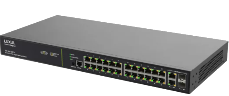 Both 1 Gb SFP ports can be aggregated for a connection speed of up to 2 Gb. The 24 PoE+ ports deliver both gigabit data and power over a single cable to 802.11af/atcompliant devices, with a maximum of 30W per port. For separately powered devices, these ports deliver network connectivity only. The total power budget is 250W for all PoE+ ports combined. The advanced Layer 2/Layer 3 features a refreshed easy-to-use management interface to simplify configuration and make this switch ideal for use in single-switch AVoIP environments. Setup of IGMP/Multicast on a per-port basis is easy, improving the setup and reliability of running audio and video over the network simultaneously.