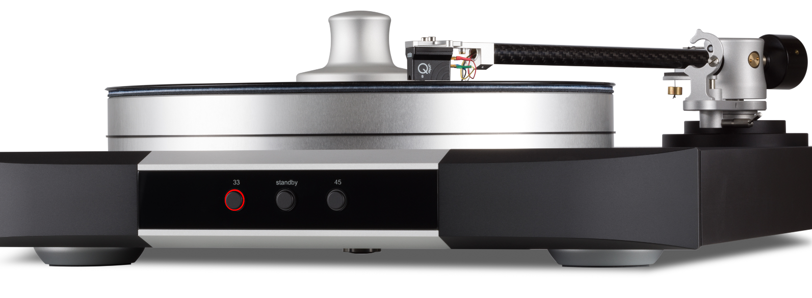 The nearly 2“ thick solid aluminum plinth is machined from a single billet and is suspended on three adjustable aluminum feet, each with a mixed-material internal suspension system while an integrated white bubble level aids in deck leveling.