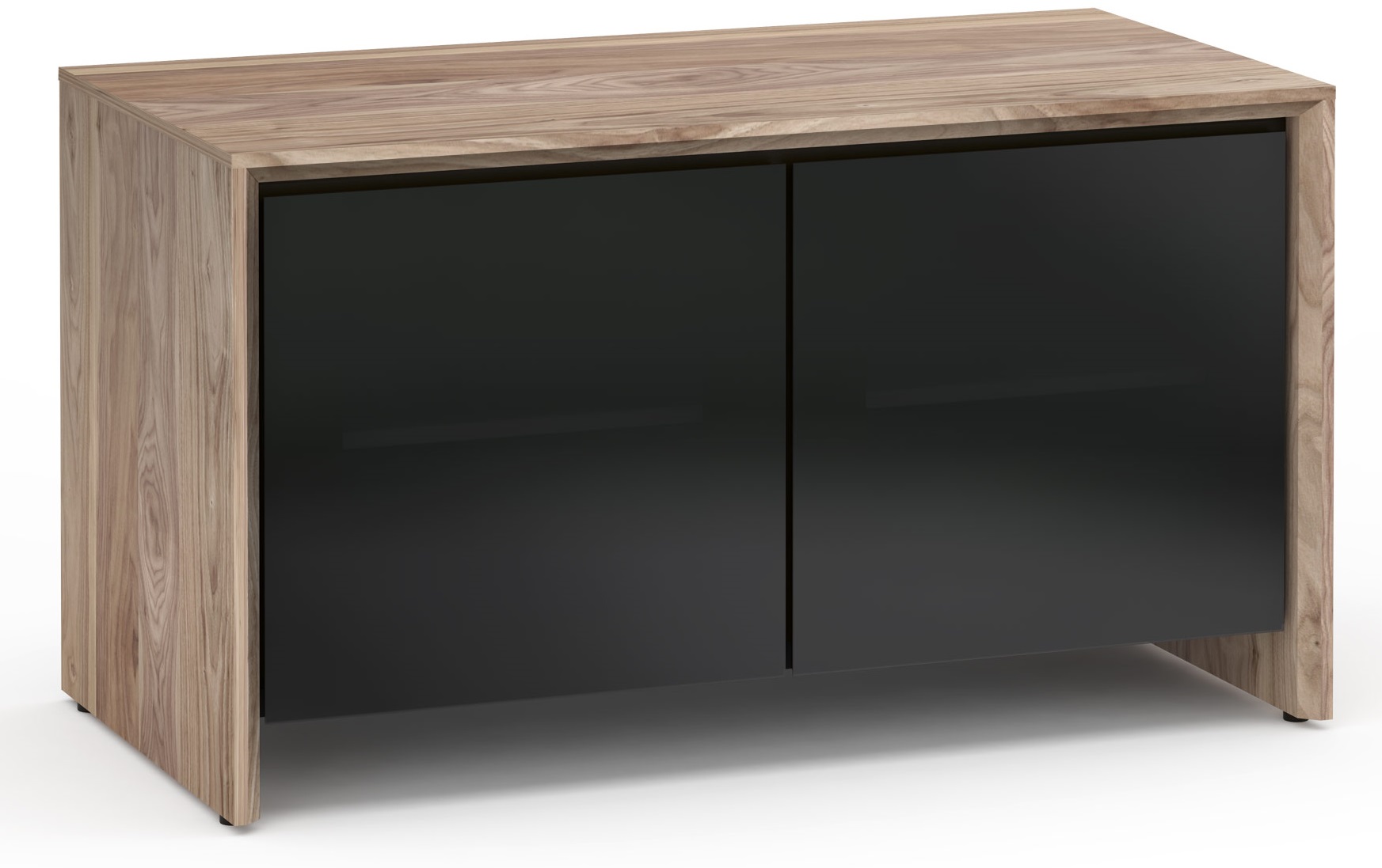 Clean, cutting-edge design with beveled edges and precision miter joints is highlighted by a natural cherry or walnut wood finish with black smoked glass or gloss white doors.