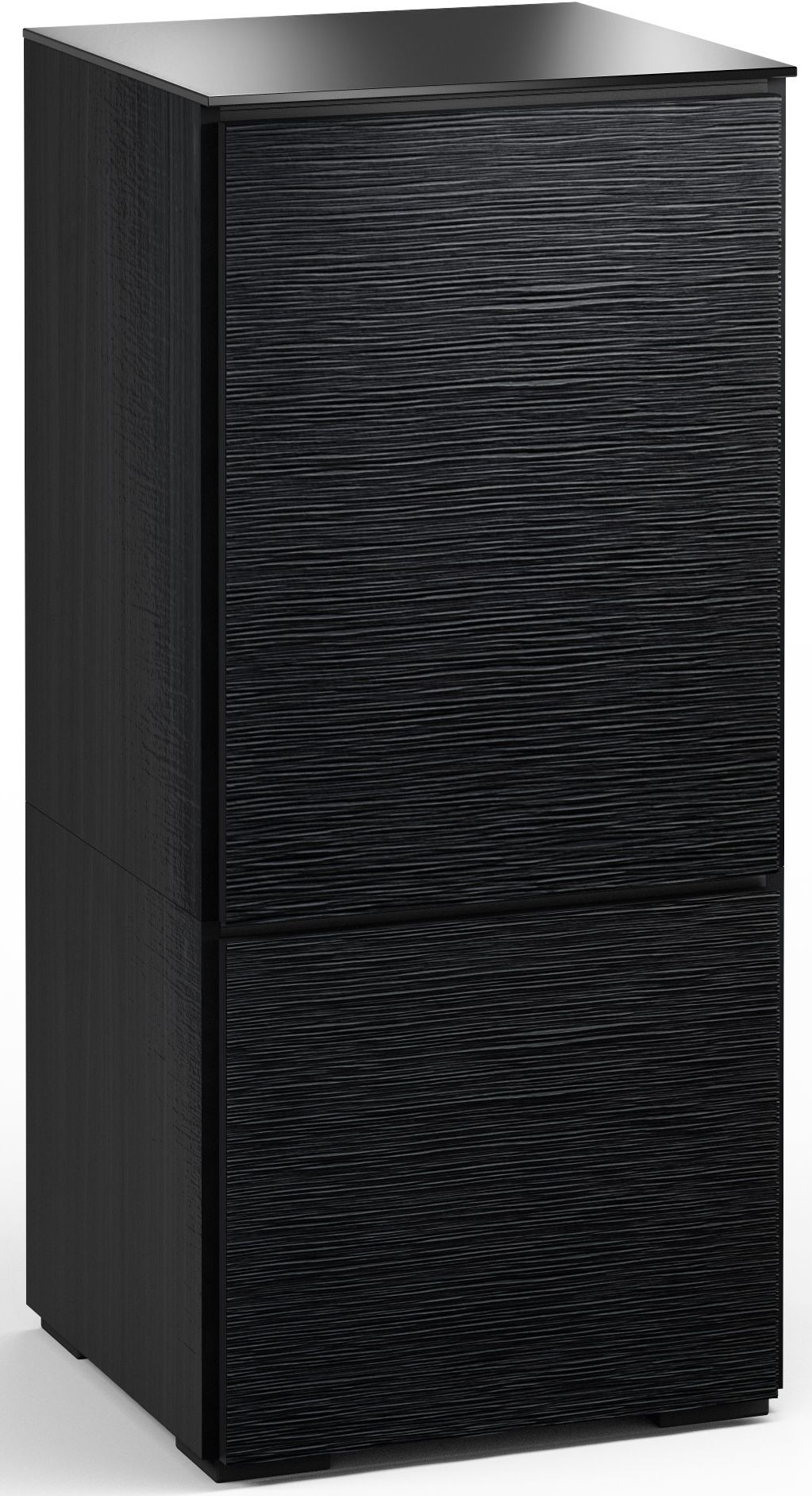 The light look and feel of tall grasses is finely set in a horizontal textured pattern. Black oak with black glass top and black feet work in unison, creating the cabinet's hi-tech facade.