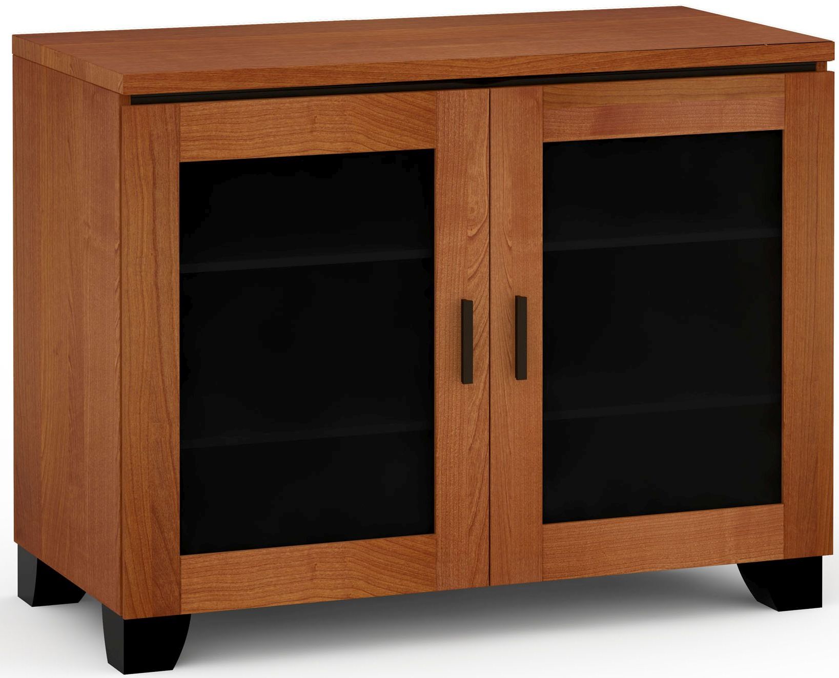 Its essence is casual comfort made unique by wide framed wood doors with smoked glass inserts. The thick wood cross section of its top give this cabinet a dramatic look.